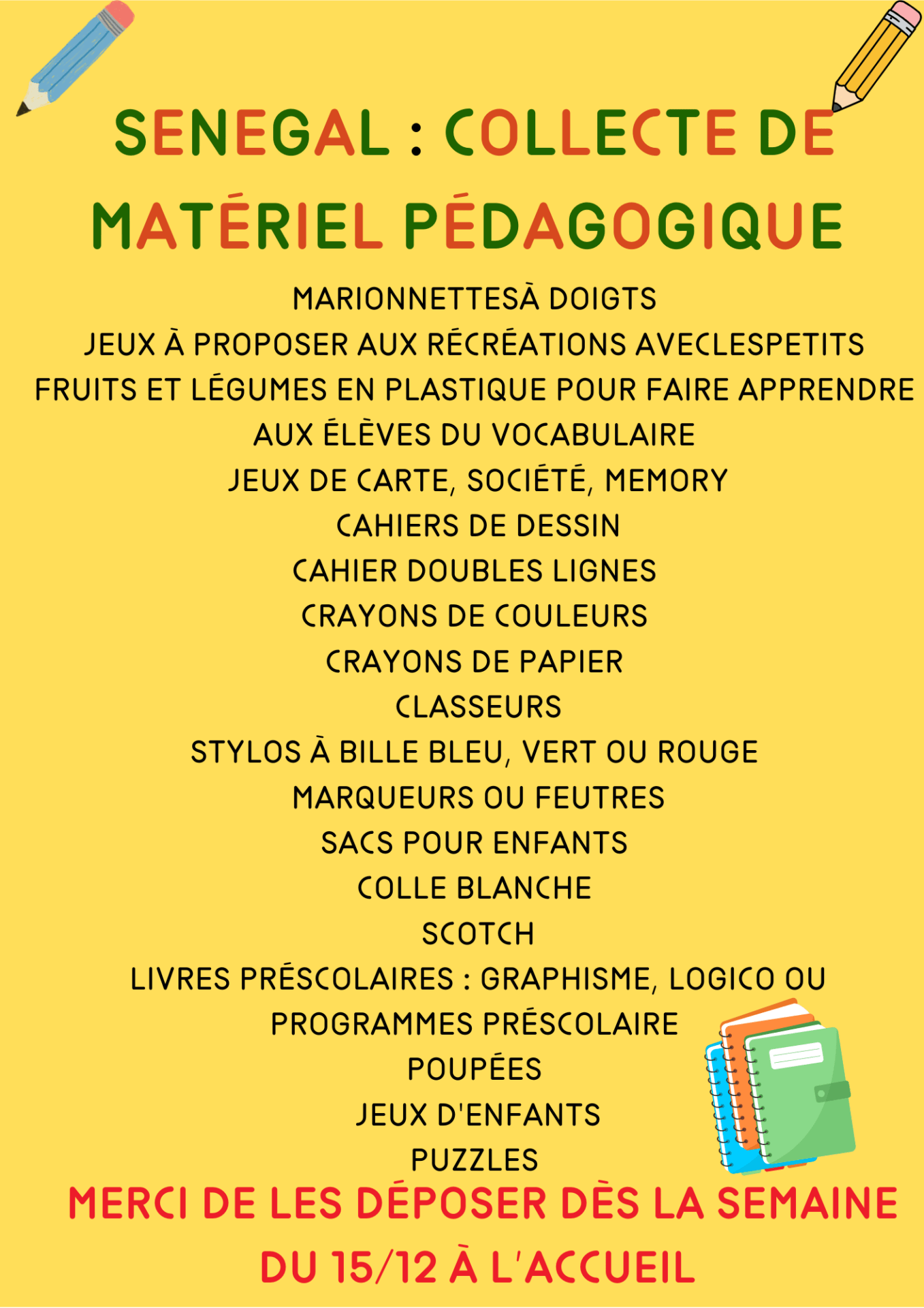 - des fournitures scolaires, à déposer à l’entrée de l’École alsacienne jusqu’au 13 février 2026 (voir la liste du matériel pédagogique demandé ci-dessous).